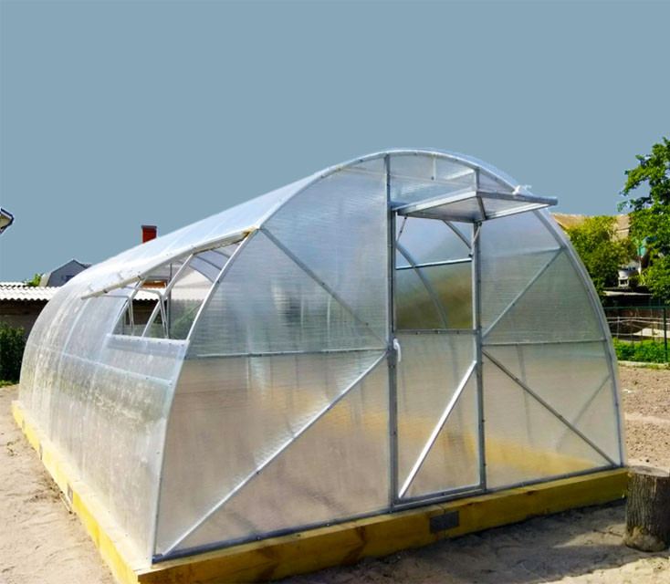 Каркас теплиці виготовлений із профільної поцинкованої труби, яка надає конструкції чудову жорсткість. Завдяки тому, що труба оцинкована, вона не схильна до корозії й не гниє в землі. До комплекту входять усі необхідні складники а саме: поздовжні та поперечні еленти каркаса, двері, квати, всілякі елементи для кріплення та дверної фурнітури (болти, гайки, ручки, петлі тощо)